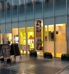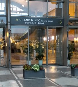 台場駅から出てグランニッコー東京 台場の方向に歩くと最初から2階になるのですが、そこにコンビニとペストリーショップがあり、そのすぐ奥にグランニッコー東京 台場の入口となります。