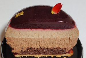 爽やかで酸味をおさえたブラックベリーのジュレを一番上にし、ミルクチョコとビターチョコのムースを土台に重ねてあります。